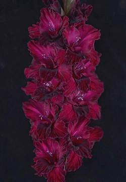 Гладиолус Игра Теней. Высота 170 см. Соцветие 90 см, 24 бутона (одновременно открыты 12). Цветки размером 11,5-14 см. Срок цветения средний. Бархатный тёмно-малиновый с чёрно-малиновыми переливами по всему бутону и чёрно-малиновым нижним лепестком. Идеально двухрядный, плотная укладка бутонов. Ткань лепестка плотная. Отличная срезка.