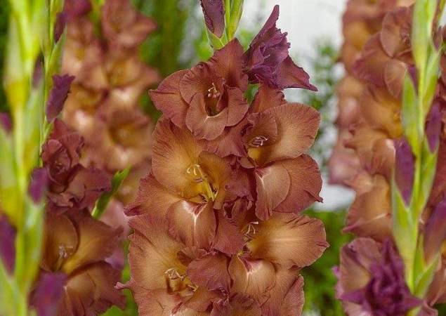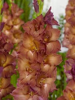 Гладиолус Индиан Саммер (Indian Summer). Крупноцветковый гладиолус представляет собой уникальный вид растений с гофрированными соцветиями необычной формы, относящийся к типу многолетних луковичных цветов. Цветок имеет бронзовый цвет разной интенсивности: у горла в нём присутствует жёлтый оттенок, ближе к краям лепестки отливают сиреневым. Сорт отличается большим количеством бутонов на цветоносе — до 20, что делает его идеальным для срезки.