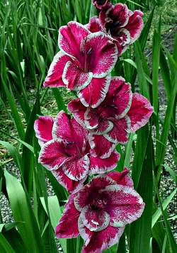 Гладиолус Иржи Вацлавик. Уникальный сорт, окраска цветка темно-малиновая, по краю лепестков широкая серебристая кайма. В колосе до 26 цветков. Одновременно раскрыты 10-11.