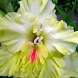 Гладиолус Изюминка. Окраска лимонно-желтая, слегка зеленоватая, с малиновой растушёвкой по краю нижних лепестков. Гофрировка защипами по всему цветку и в горле. Ткани лепестков плотные, прочные. Двухрядный. Устойчив к солнцу, непогоде.