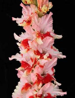 Гладиолус Коктейль №2. Нежно-розовый. Нижние лепестки золотистые с крупным красным пятном. Брызги от пятна и на верхних лепестках. Цветки размером более 14 см, очень сильно гофрированные. Срок цветения средне-ранний.