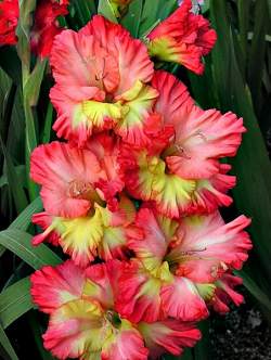 Гладиолус Коралловые Острова. Коралловый с ярко-жёлтыми нижними лепестками. Высота 155 см. Цветки размером 11,5-14 см. Гофрировка очень сильная. В соцветии одновременно могут быть открыты 9 из 21 цветка. Срок цветения ранне-средний.