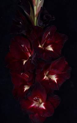 Гладиолус Кот Бегемот. Высота 100 см. Соцветие 50 см. 18 бутонов (6-7 одновременно открыты). Насыщенный черно-красный цветок с ярко-белым "галстуком-бабочкой" в горле. Гофрирован крупными складками и защипами. Цветки размером более 14 см. Срок цветения средний. Стройный, двухрядный колос. Отличная срезка.