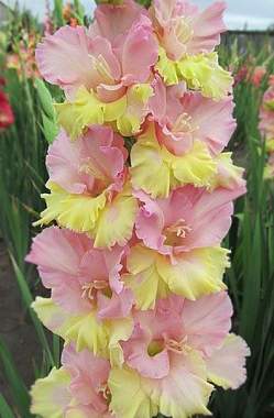 Российские гладиолусы — отличаются высоким (до 180 см) и прочным цветоносом, крупными цветками (12-16 см), при этом одновременно открыто 8-10 бутонов! Гладиолусы российской селекции неприхотливы в выращивании! Практически все сорта имеют сильно гофрированные цветы! Изящность и необычная окраска бутонов делает эти цветы идеальными для срезки!
