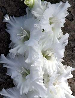 Гладиолус Ластека. 400-С-СГ-10, Дипанс 23/10-12. Белоснежный, идеально уложенный колос, плотная фактура лепестков. В соцветии 23 цветка, одновременно раскрыты до 12.