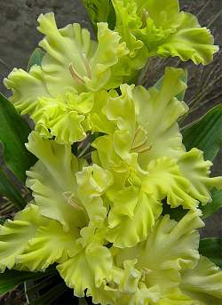 Гладиолус Лучистая Зелень, 402. Цветки светло-зеленые (с салатовым отливом) и ярко выраженной гофрировкой, очень красивой формы. В колосе 20 бутонов. Одновременно открытых цветков 8. Один из лучших сортов в своем классе окраски. Многократный участник и дипломант выставок.