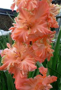 Гладиолус Магия Цвета. 525-Р-07. Шикарный, с крупными цветками персикового цвета. Кайма салатового цвета подчеркивает тепло и сияние кораллово-персикового тона. Гофрировка прекрасная. Высота 150 см. В колосе 22 бутона, одновременно раскрыты — 9.
