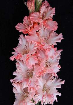 Гладиолус Манящая Даль, 543. Светло-розовый цвет сгущается к контуру лепестка, но переходит в тонкую светлую кайму. На нижних лепестках хаотично расположенная тёмно-розовая штриховка. Красиво гофрирован глубокими складками. Ткань лепестка плотная. Красивый декоративный и срезочный сорт.