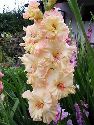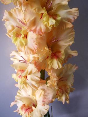 Гладиолус Майя Плисецкая. 20-С-97. Пышный светло-палево-оранжевый с малиновым пятном в горле. Гладиолус с сильно гофрированными цветами с плотной шелковисто-восковой фактурой. Колос высокий стройный, соцветие двухрядное. Луковица белая с легкими кремовыми оттенками. Призер и дипломант выставок. Лидер Московской выставки-2010. Входит в пятерку лучших в своей категории.