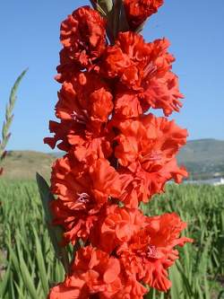 Гладиолус Метель Августа. Тёмно-красный. Цветки размером 11,5-14 см, сильно гофрированные. В плотном двурядном соцветии может быть 8 одновременно открытых цветков из 20. Высота 140 см. Срок цветения средний. Стойкая, транспортабельная срезка потрясающей красоты.