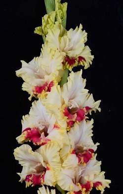 Гладиолус Мультяшка. Высота 140 см. Соцветие 70 см. 20 бутонов (7-8 одновременно открыты). Кремовый гладиолус с темно-красным пятном в лимонно-желтом ореоле. Сильно гофрирован мелкими складками. Цветки размером 11,5-14 см. Срок цветения средний. Очень стройный, двухрядный колос.