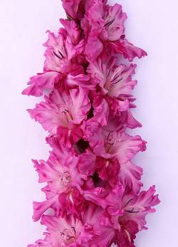 Гладиолус Ночной Шторм, 575. Высота 140 см. Соцветие 70 см, 21-22 бутона (8 одновременно открыты). Бутон 13 см. Насыщенно-лилово-сиреневый, более интенсивный по краям и светлее с прожилками к центру. Нижний лепесток тёмно-лилово-малиновый с толстой растушеванной стрелкой. Сильно гофрирован глубокими частыми защипами по всему бутону.