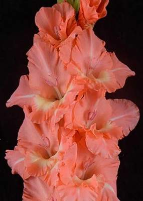 Гладиолус Поросёнок Фунтик. Красивый мощный сорт. Высотой до 150 см. Соцветие 80 см из 24 бутонов. Одновременно открыты девять. Окраска цветков лососево-розовая с кремовым пятнышком. Колос плотный, хорошо сложенный. Отличная срезка.