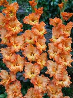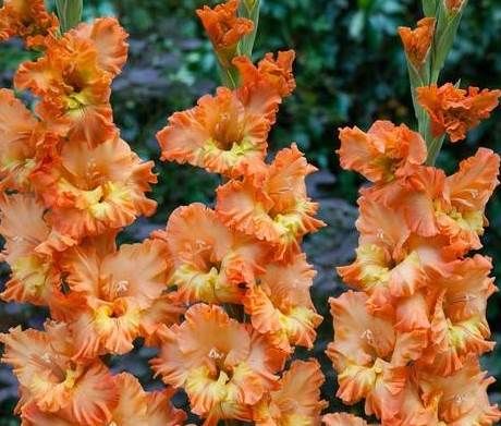 Гладиолус Принцесс Раффл (Princess Raffl). Это многолетник с необычными крупными цветами. Он невероятно красив, верхние лепестки лососево-красные, нижние желтые. Более яркая кайма расположена по всему волнистому краю. Каждое колосовидное соцветие сплошь покрыто венчиками. Гладиолус прекрасен в любом уголке сада или в вазе на столе.