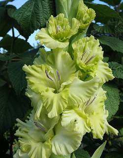 Гладиолус Прыткая Ящерка. 404-С, Фотин. Светло-зеленый с красивейшей гофрировкой. Очень красиво на зеленом фоне смотрятся фиолетовые тычинки. Срок цветения средний.