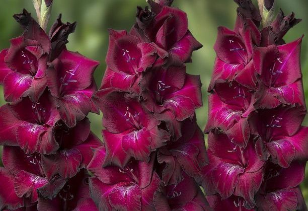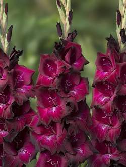 Гладиолус Рэвел (Revel). Многолетнее крупноцветковое клубнелуковичное растение семейства Ирисовые. Высота растения 130 см. Цветок бордовый с темной, почти черной каймой и белыми лучиками от основания. Луковицы среднего размера. Срезанные соцветия стоят в воде 10-12 суток.