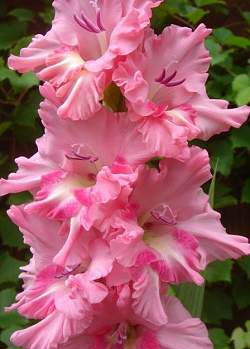 Гладиолус Ружова Соната. 465-C-07. Нежный, малиново-розовый, приятной тональности. На нижних лепестках белоснежное пятно с малиновым растушеванным окаймлением. Красивая гофрировка.