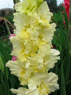 Гладиолус Сгущеное Молоко. Сорт Сгущенное молоко популярен благодаря быстрому росту и способностью легко размножаться. Кроме этого, гладиолус отличается привлекательными декоративными характеристиками и хорошо сохраняется в срезке. Стебли облиственные, светло-зеленого цвета, и способны вырастать в высоту до 130-140 см. Прикорневые розетки из крупных, длинных листьев линейной формы, зеленого цвета. Соцветие крупное, стройное, колосовидное и состоит из 23 бутонов с очень плотной посадкой в 2 ряда, одновременно открыто 9. Лепестки цветков очень плотные, с матовой поверхностью.
