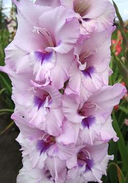 Гладиолус Синеглазая Мечта. 471-СР-09. Окраска цветков светло-лавандовая с фиолетовым пятном на нижнем лепестке, также по всему полю лепестков разбросаны фиолетовые штрихи, по краю лепестка штрихи образовывают нежнейшую кайму. Окраска редкая. Цветоносы крепкие. На цветоносе 20 бутонов, одновременно раскрыты 10.