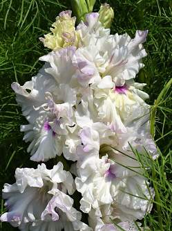 Гладиолус Снежное Гофре. 401-ОР-2008 ССГ Степанова. Белоснежные цветки с сильной кружевной гофрировкой с защипами. На нижнем лепестке сиреневое пятнышко. Края лепестков со светло-сиреневым отсветом, местами зеленоватые. Колос стройный, прочный. Один из самых ранних сортов. Колос состоит из 21 бутона, одновременно раскрыты 7-8.