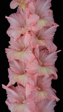 Гладиолус Солнечный Берег. Нежно-лососёвый со светло-жёлтым пятном на нижнем лепестке. Гофрированный. Цветки диаметром более 14 см. В соцветии может быть 10 одновременно открытых цветков из 25. Соцветие величественное, с отлично уложенными цветками. Срок цветения средне-ранний. Сорт срезочный.