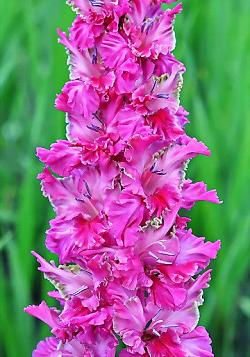 Гладиолус Сонг (Песня), 477. Высота 130 см. Соцветие 65-75 см, 25 бутонов (одновременно открыто до 9). Бутон 12-13 см. Лепестки цветков пурпурно-сиреневые, верхние — светлее, нижние темнее. Концы внутренних лепестков в большей степени, чем наружных при открывании цветка переходят из зеленоватых тонов в стальные с синим оттенком (5 мм кайма).