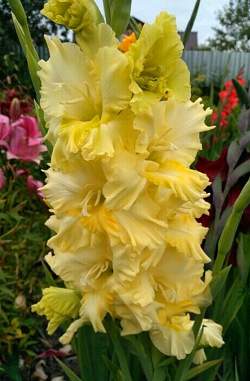 Гладиолус Страна Лимония. Высота 160 см. Соцветие 75 см, 22 бутона (одновременно открыты 6). Яркий, лимонно-жёлтый. Сильная, изящная, красивая гофрировка. Крупный бутон. Цветки размером более 14 см Срок цветения средний.