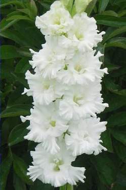 Гладиолус Сын Луны. 500, ср, Фотин. Цветки очень крупные, широко открытые, белые с кружевной гофрировкой. Соцветие плотное.