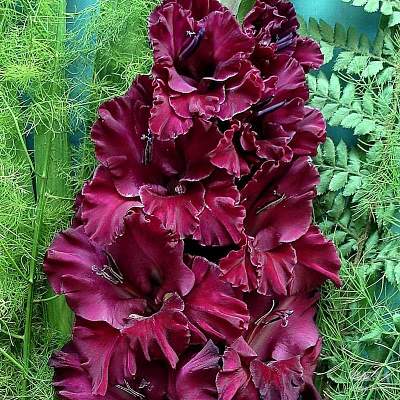 Гладиолус Таинство Ночи, 458. Бархатные, сильно гофрированные цветы с чистой чёрно-пурпурной окраской. Бутоны почти черные. Высокое идеально двухрядное соцветие с плотной укладкой цветов. Мощный, отлично растет.