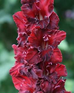Гладиолус Талисман. 458. Черно-красный с шоколадным оттенком, по краю лепестков серебристая кайма. Бархатистый. Высота 150 см, соцветие — 75 см. Из 24 бутонов одновременно раскрыты 9. Цветки до 13 см.