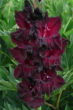 Гладиолус Темная Сторона Силы. Чёрно-красный. Цветки размером более 14 см, гофрированные. В соцветии может быть 8 одновременно открытых цветков из 22. Срок цветения средний. Один из самых чёрных.