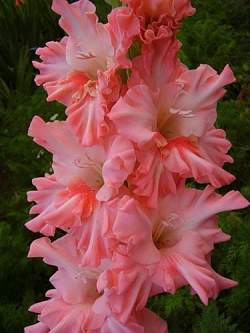Гладиолус Виктор Астафьев. Знаменитый сорт селекции Киселёва. Великолепный чисто-розовый, к краям лепестков окраска слегка сгущается. В горлышке красноватый муар. Гофрировка сильная красивыми складками. Очень плотная фактура лепестков. Прочный колос. Размер цветков — более 14 см. Высота цветоноса 140 см. Держит одновременно в роспуске 9 цветков. Срок цветения средне-ранний.