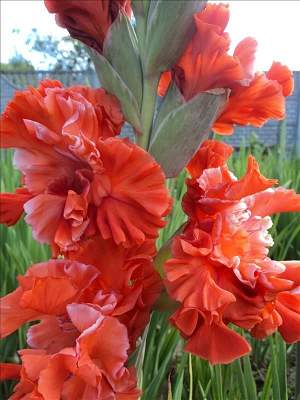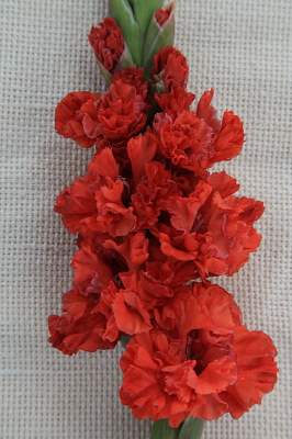 Гладиолус Юра Шевчук. Удивительная, фантастическая гофрировка и чистый цвет! Цветки крупные, ярко-красные, гофрированные, плотной фактуры. Хорош для срезки. Цветки размером 11,5-14 см. В соцветии могут быть 8 одновременно открытых цветков из 22. Высота 140 см. Срок цветения средний.