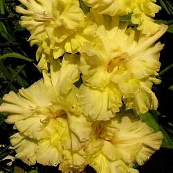 Гладиолус Золотая Десятка. Золотисто-жёлтый. Сильно гофрированный. Бутоны очень красивые. Размер цветков 11,5-14 см. Фактура лепестков суперплотная. Соцветие прочное, плотное. Держит одновременно в роспуске 9 цветков. Цветонос высотой 150 см. Срок цветения средне-ранний.