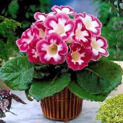 Глоксиния Blanche de Meru (Бланш де Меру). Многолетнее травянистое бесстебельное или с коротким стеблем растение с клубневидным корневищем и бархатисто супротивно расположенными листьями. Используют глоксинии в качестве комнатного растения, способного достойно украсить квартиру или дом своим присутствием. Высота растения 25 см. Цвет красно-белый.