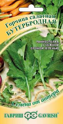 Горчица листовая Бутербродная. Раннеспелое (от всходов до уборки на зелень 17-20 дней) однолетнее растение высотой до 28 см, диаметром 20 см. Лист среднего размера, желто-зеленый, цельный, с мелкозубчатым краем, с приятным горчичным вкусом. Сорт рекомендуется для выращивания свежей зелени в открытом и защищенном грунте. Горчица листовая хорошо растет на обычных почвах, требовательна к влаге, при ее недостатке листья становятся грубыми, их вкус ухудшается. Высевают рядовым способом на расстоянии 10-15 см (глубина заделки семян до 1 см). При появлении первых листочков проводят прореживание, оставляя между растениями 4-5 см. К уборке приступают, когда растения достигнут 10-15 см высоты. Горчицу срезают ножницами или выдергивают с корнями. Масса одного растения 30-50 г. Урожайность зелени до 4 кг/кв.м.