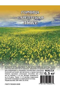 Горчица Люкс сарептская (сидерат). В отличие от Горчицы белой более засухоустойчивая культура. Способствует очищению участка от сорняков, избавляет от проволочника, гороховой плодожорки и слизняков; способствует угнетению болезней растений: фитофтороза и парши картофеля.