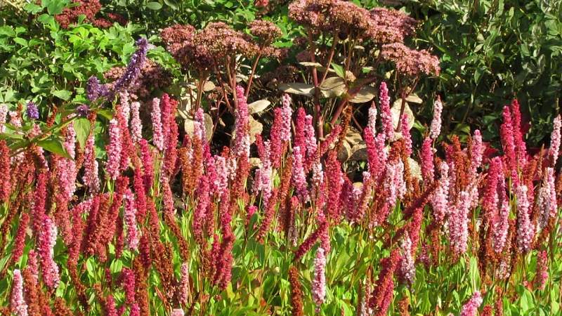 Горец Darjeeling Red (Дарджилинг Ред). Высокодекоративное растение с красными и розовыми соцветиями высотой 40 см. Цветет в июне-июле. Хорошо растет на солнце, может сильно разрастаться и образовывать заросли. Зимостоек, но в бесснежные зимы может выпадать.