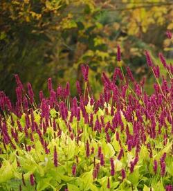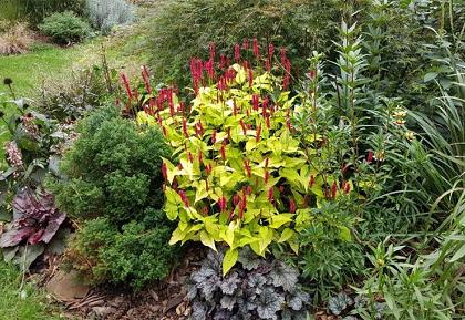 Горец свечевидный Golden Arrow (Голден Эрроу). Достоинством этого прекрасного сорта является не только необычная окраска листьев, но и то, что он очень компактен. Всего 50 см в высоту и столько же в диаметре. У сорта желтые сердцевидные листья и узкие свечевидные соцветия-стрелы ярко-малинового цвета. Вот почему оно называется "Золотой Стрелой".