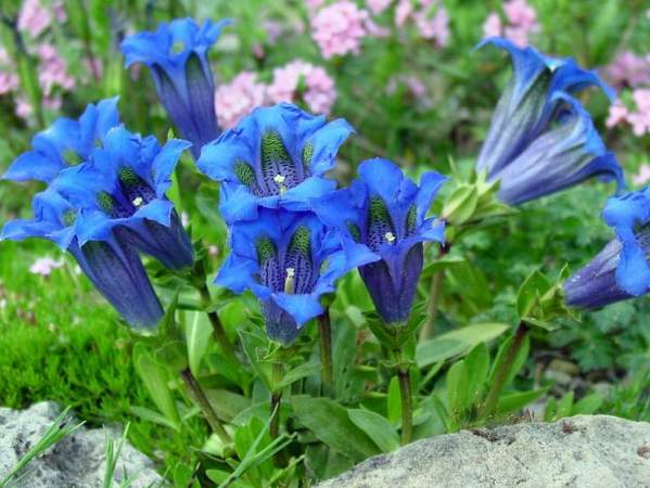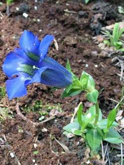 Горечавка динарская. Многолетнее декоративное растение высотой 10-15 см. Листья вытянутые, овальной формы, узкие, зелёные, сохраняют яркую окраску даже под снегом. Цветки диаметром до 5 см, колокольчатой формы, на коротких ножках. Расцветка ярко-синяя с зелено-серой серединой.