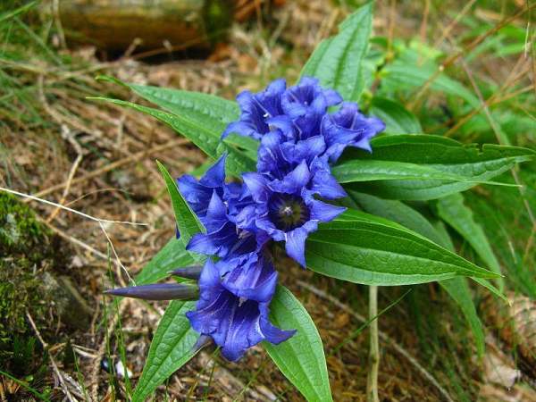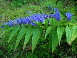 Горечавка ластовневая. Довольно высокий вид, до 60 см. Цветоносы прямые, цветки образуются в верхних пазухах. Они синие, около 5 см, собраны в соцветия по три в пазухе. Хорошо растет на солнце при достаточном увлажнении почвы. Цветет в течение дня, вечером закрывается.