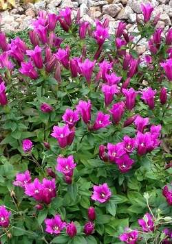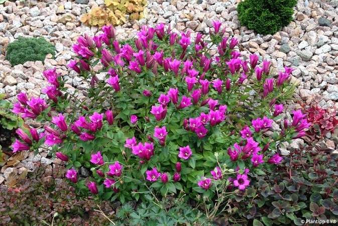 Горечавка Zuiko Rindo (Зуйко Риндо). Цветет осенью, в августе-сентябре. Зимостойкий многолетник для полутенистых мест. Стебли стелются, образуют розетку. Листья на побегах расположены супротивно. Цветки трубчатые, смотрят вверх, пурпурно-розовые. Любит богатую кислую почву, влажную, но хорошо дренируемую.