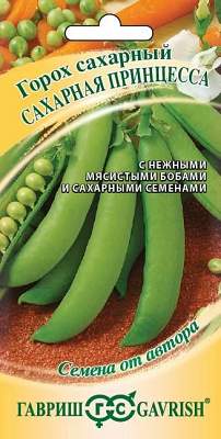Горох Сахарная принцесса. Среднеранний (55-65 дней от всходов до начала сбора бобов) сахарный сорт. Растение высотой до 120 см. Бобы с толстыми мясистыми стенками, без пергаментного слоя, слабоизогнутой формы, длиной 10 см, широкие, светло-зеленые, с 6-8 горошинами. Содержат витамины А, С, В1, минеральные соли и растворимые волокна, очень полезны для детского и диетического питания. Бобы употребляют в пищу в молочной спелости вместе с семенами. Урожайность 0,7-1,2 кг/м?. Посев производят ранней весной на солнечной стороне участка на глубину 4-6 см. Схема посева: 15x30 см. Растения нуждаются в опоре.