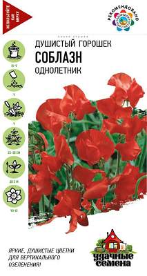 Горошек душистый Соблазн. Однолетнее растение из семейства Бобовые с лазающими побегами высотой до 2 м (длина цветоноса 30-40 см). Цветки крупные, красные, собраны в изящные кисти по 5-8 шт., обладают приятным ароматом. Растение светолюбивое, влаголюбивое и холодостойкое, предпочитает плодородные суглинистые и супесчаные почвы. Выращивают рассадным и безрассадным способом. Семена перед посевом желательно прорастить. Используется для вертикального озеленения. Срезанные цветки хорошо сохраняют свежесть в воде и используются в мини-букетах.