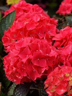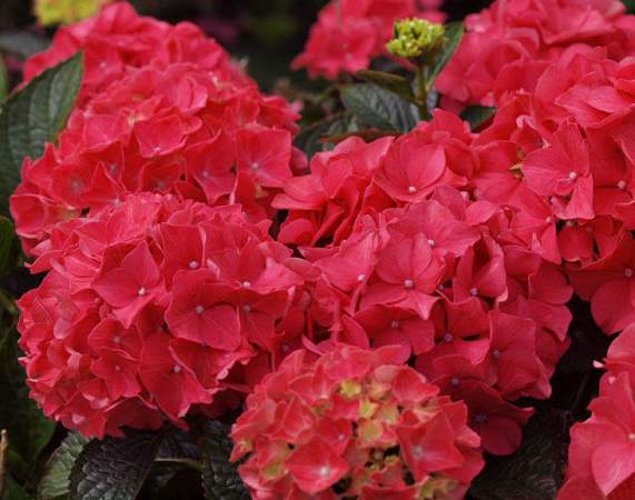 Гортензия крупнолистная Alpengluhen (Альпенглюхен). Насыщенно-красные цветки появляются в июне-июле. Считается одним из лучших сортов крупнолистной гортензии красного цвета. Цветет на прошлогодних побегах.
