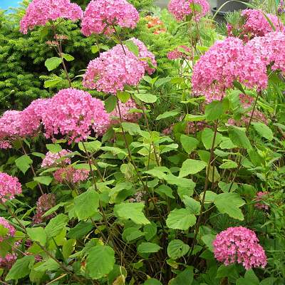 Цветки при распускании яркие пурпурно-розовые, затем розовые, при отцветании светло-розовые, стерильные цветки диаметром 1,5 см. Соцветия щитковидные, диаметром 12,5 см и высотой 8 см.