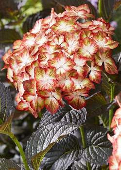 Гортензия Black Diamond Light My Fire (Блэк Даймонд Лайт Май Фаер). Входит в серию тёмнолистных гортензий "Black Diamonds" производства компании De Jong Plant. Куст компактный, высотой до 60 см. Цветет на побегах как текущего, так и предыдущего года. Листва шоколадного цвета. Соцветия имеют оригинальное сочетание оттенков - у цветка лимонно-салатовый центр, который отделен от красной окантовки темно-зеленым слоем. Цвета яркие и насыщенные.