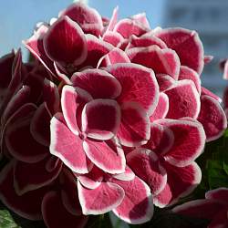 Гортензия Camilla (Камилла). Цветки тёмно-розовые с белой каймой. Соцветия диаметром до 20 см, шаровидные. Цветение в июне-августе на побегах прошлого года. Побеги крепкие, прямостоячие. Кусты компактные, высотой и шириной 100-120 см, при выращивании в контейнере высота 60-70 см. Почва влажная дренированная.