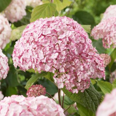 Гортензия древовидная Candybelle Lollypop (Кендибелль Лоллипоп). Лиственный кустарник с крепкими, хорошо развитыми побегами. Крона округлая, ветви крепкие, хорошо выдерживают крупные нежно-розовые соцветия. Цветёт на побегах текущего года с июля до сентября. Особенностью этой гортензии является обильное цветение.