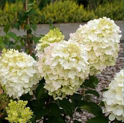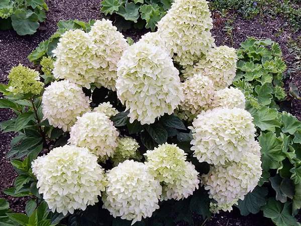 Гортензия Cotton Cream (Коттон Крим). Соцветия округлые, плотные, состоят практически только из стерильных цветков. Цветки средней величины, вначале зеленоватые, затем кремово-белые. К осени соцветия приобретают легкий румянец.